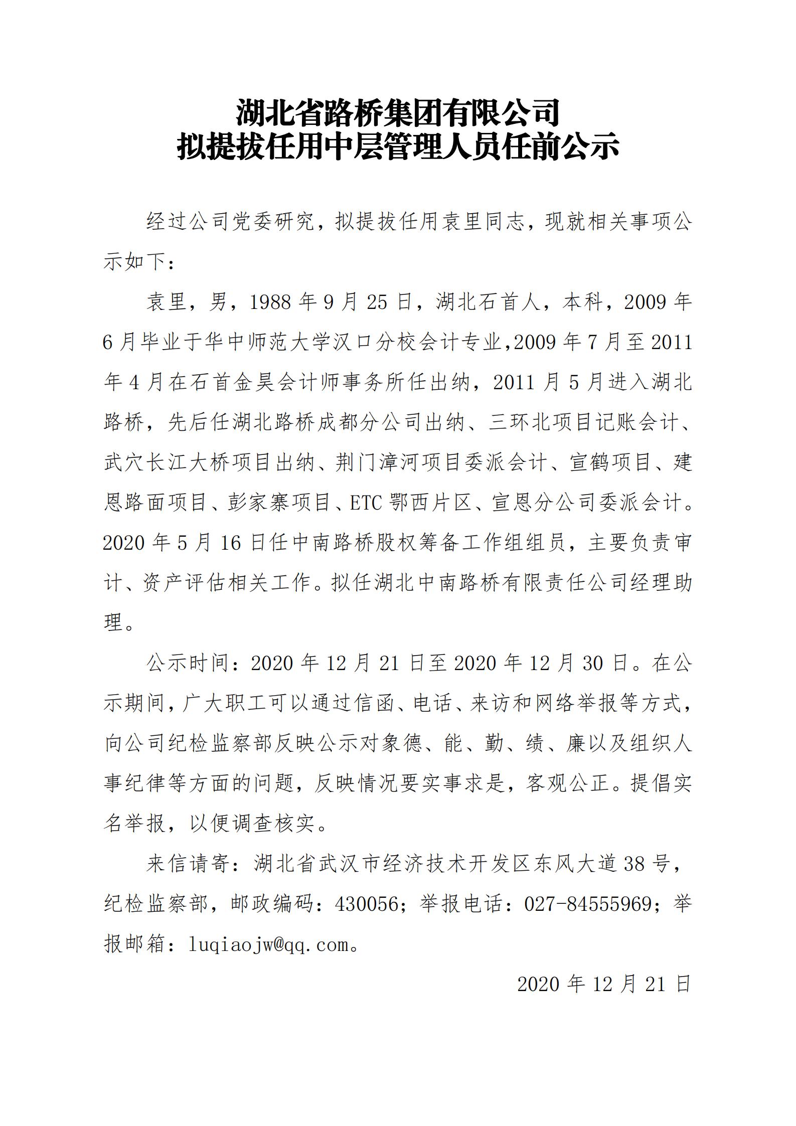 湖北省路橋集團有限公司擬提拔任用中層管理人員任前公示