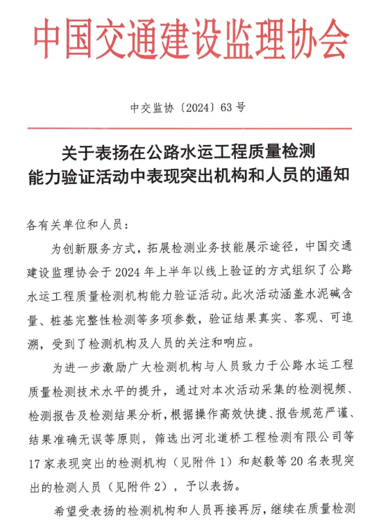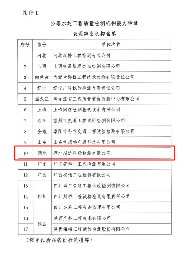 近日,中國交通建設監理協會發布《關于表揚在公路水運工程質量檢測能力驗證活動中表現突出機構和人員的通知》,湖北路橋旗下的瑞達檢測公司榮獲“表現突出機構”稱號,且是湖北省內唯一獲得表彰的檢測單位。