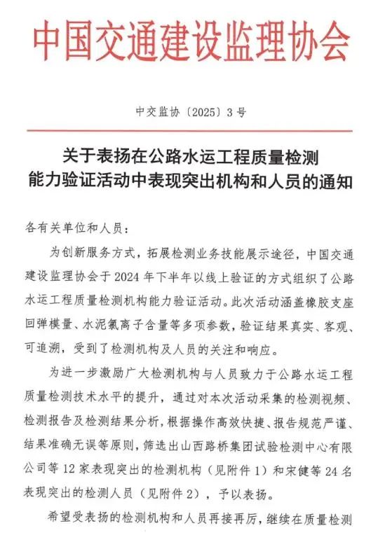 1月9日,中國交通建設監理協會發布表彰通知,瑞達科研檢測公司成功蟬聯第二屆公路水運工程質量檢測能力驗證“表現突出機構” 榮譽,是全省唯一一家連續兩屆獲此榮譽的檢測機構。