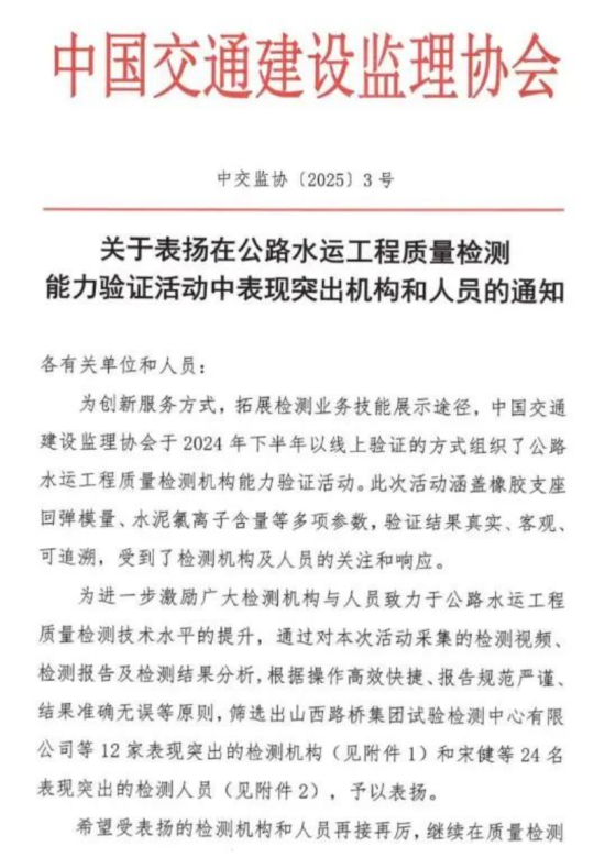 1月9日,中國交通建設監理協會發布表彰通知,聯投湖北路橋瑞達科研檢測公司成功蟬聯第二屆公路水運工程質量檢測能力驗證“表現突出機構”榮譽。成為全省唯一一家連續兩屆獲此榮譽的檢測機構。